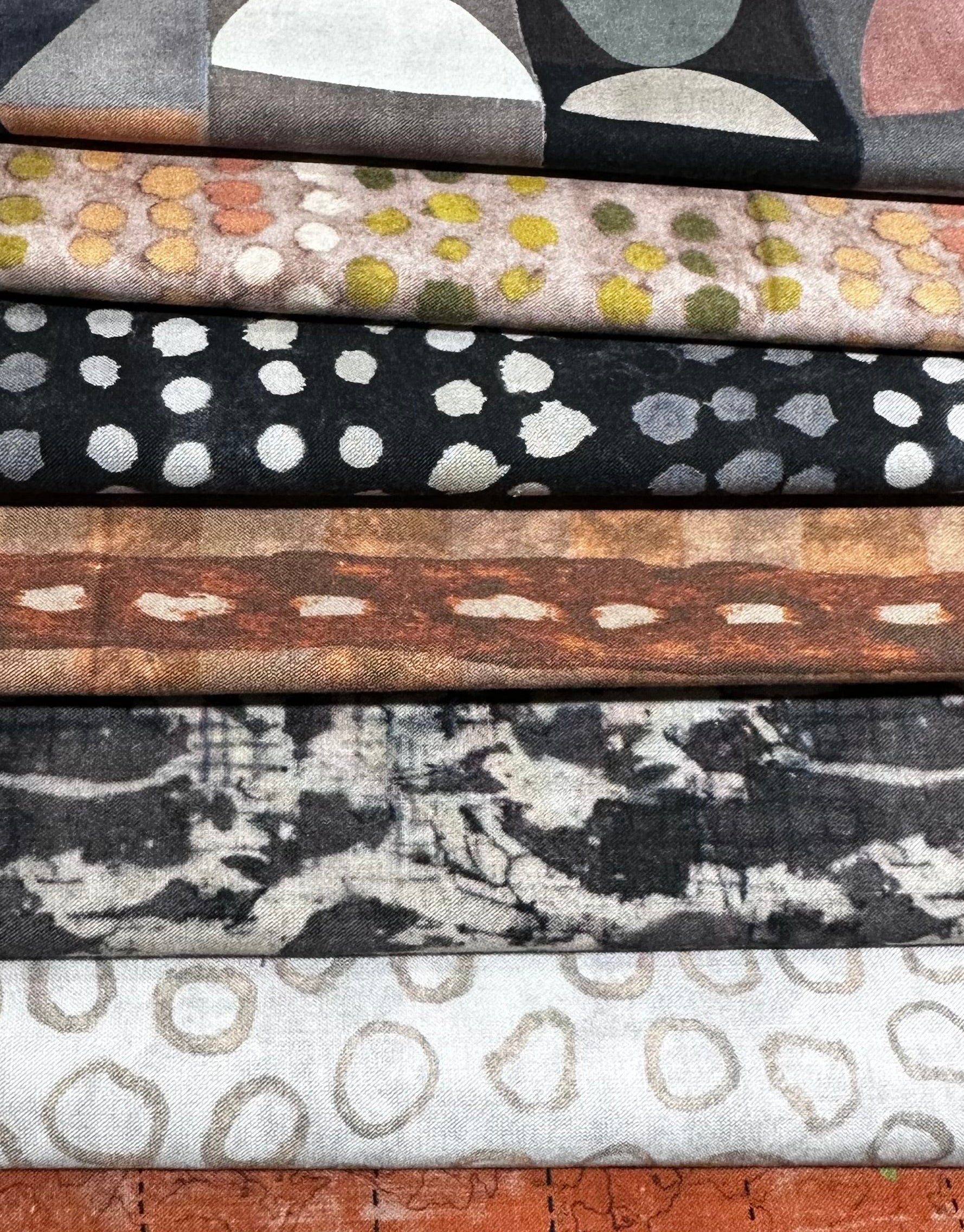 This bundle has 7 fabrics. It is available in fat quarters or half yards.